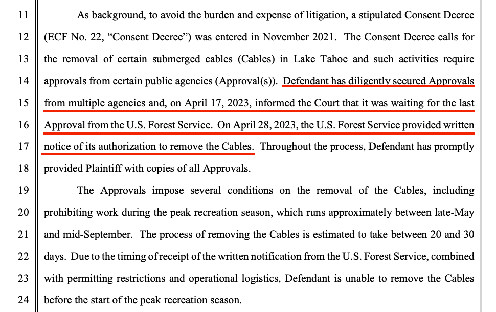 While a skeptic can pick apart the lack of admission and how they treated the presence of lead - the fact remains that they committed real resources to remove the cables. While it took some extensions, they stayed true to their word of obtaining all the necessary permits to remove the cables. In their May 19, 2023 and July 18, 2023 court filings they confirm they secured all approvals, with the latter listing the required agencies in detail. This achievement resents hundreds if not thousands of hours of work, as well as significant financial investment.